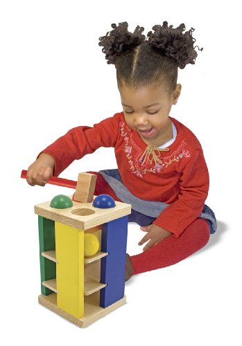 The classic pounding toy has been taken to new "towering" heights! Pound the four brightly colored balls through the tower's holes, then watch and listen as they roll down the ramps. Sturdy wooden hammer included. Measures 10" x 6 x 5.7". Incredible value and superior craftsmanship make this item a Melissa & Doug Deluxe Pound and Roll Tower Do not Miss!!